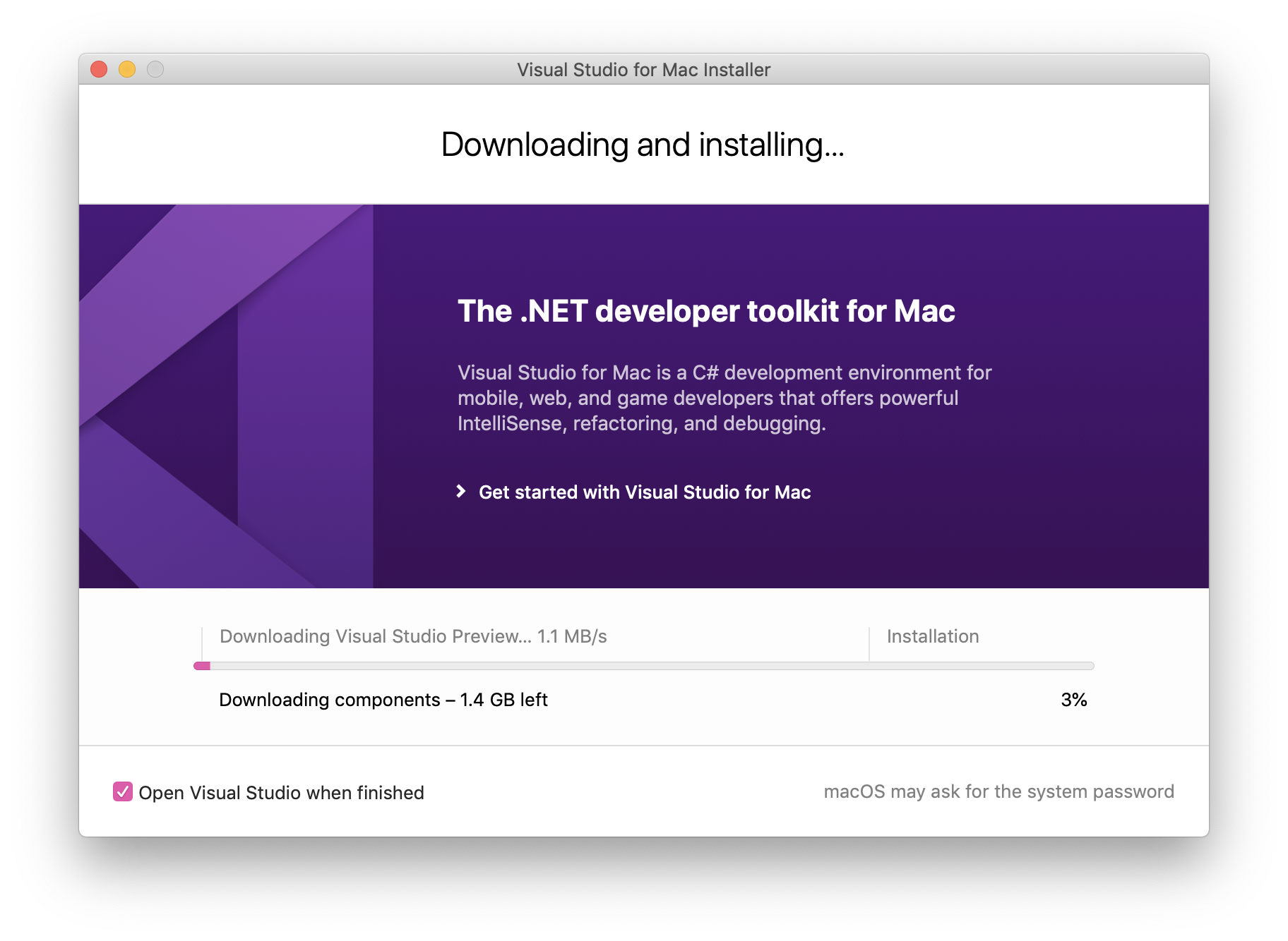 The installer will display progress as it downloads and installs Visual Studio for Mac and the selected workloads. You'll be prompted to enter your password to grant the privileges necessary for installation.