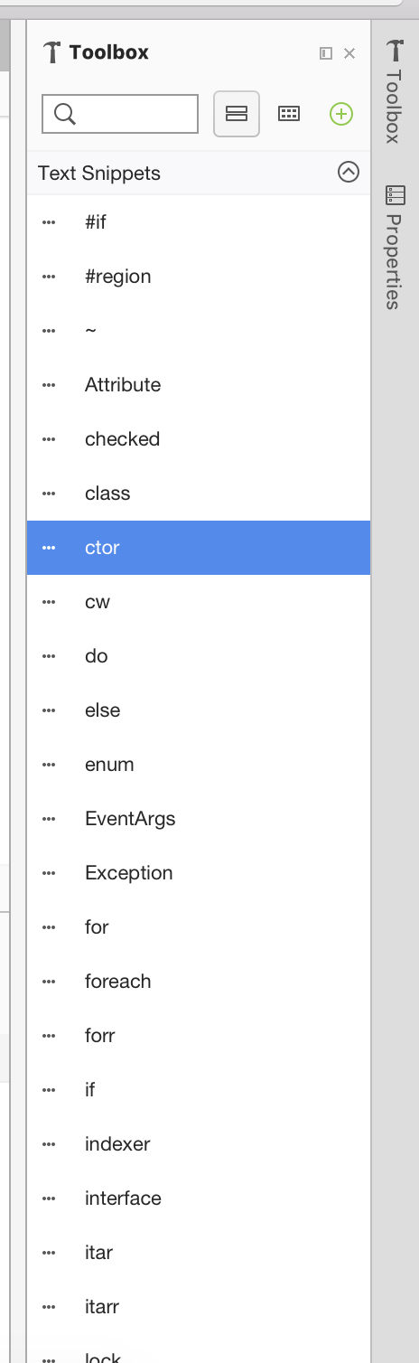 Toolbox – Use the Toolbox Window to display a list of all code snippets. Drag any template from the toolbox into the correct position in the source code: