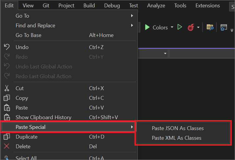 If you don't see the Paste Special option on the Edit menu, make sure that you have at least one of the following workloads installed: ASP.NET and web development, Azure development, or .NET desktop development. Then, make sure that you select the program file for your app. For example, for a C# app, select the Program.cs file in Solution Explorer.