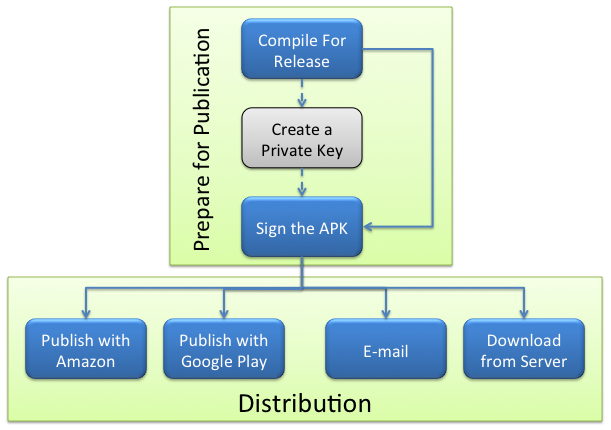 As can be seen by the diagram above, the preparation is the same regardless of the distribution method that is used. There are several ways that an Android application may be released to users: