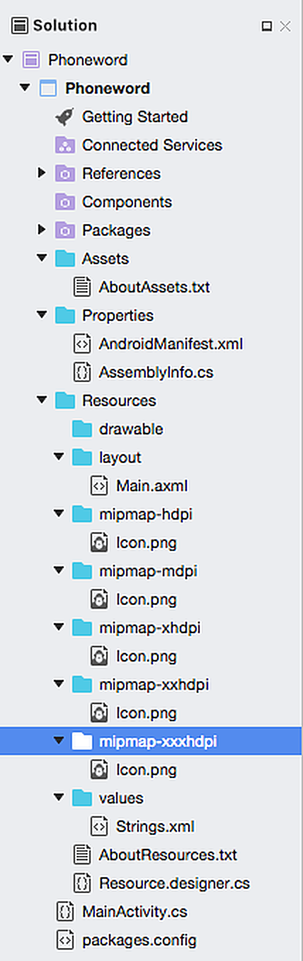 • Assets – Contains the files the application needs to run including fonts, local data files, and text files. Files included here are accessible through the generated Assets class. For more information on Android Assets, see the Xamarin Using Android Assets guide.