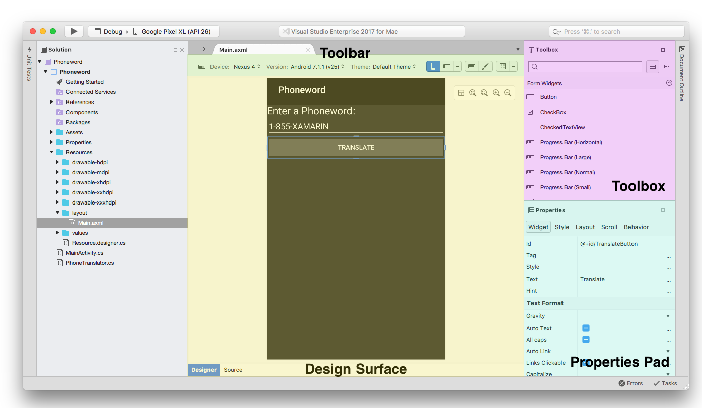 This XML source code should contain four control elements: Two TextViews, one EditText and one Button element. For a more in-depth tour of the Android Designer, refer to the Xamarin Android Designer Overview guide.