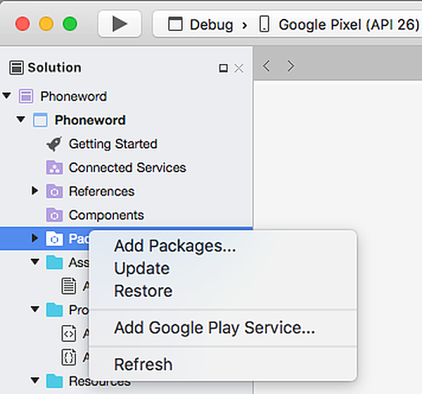 To add one or more Google Play Service libraries, right-click the Packages node in your project tree and click Add Google Play Service...:
