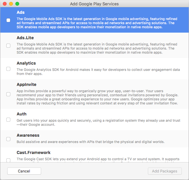 Google Play Services is a set of add-on libraries that allows Android developers to take advantage of the most recent features from Google such as Google Maps, Google Cloud Messaging, and in-app billing. Previously, bindings to all Google Play Services libraries were provided by Xamarin in the form of a single package – beginning with Visual Studio for Mac, a new project dialog is available for selecting which Google Play Services packages to include in your app.