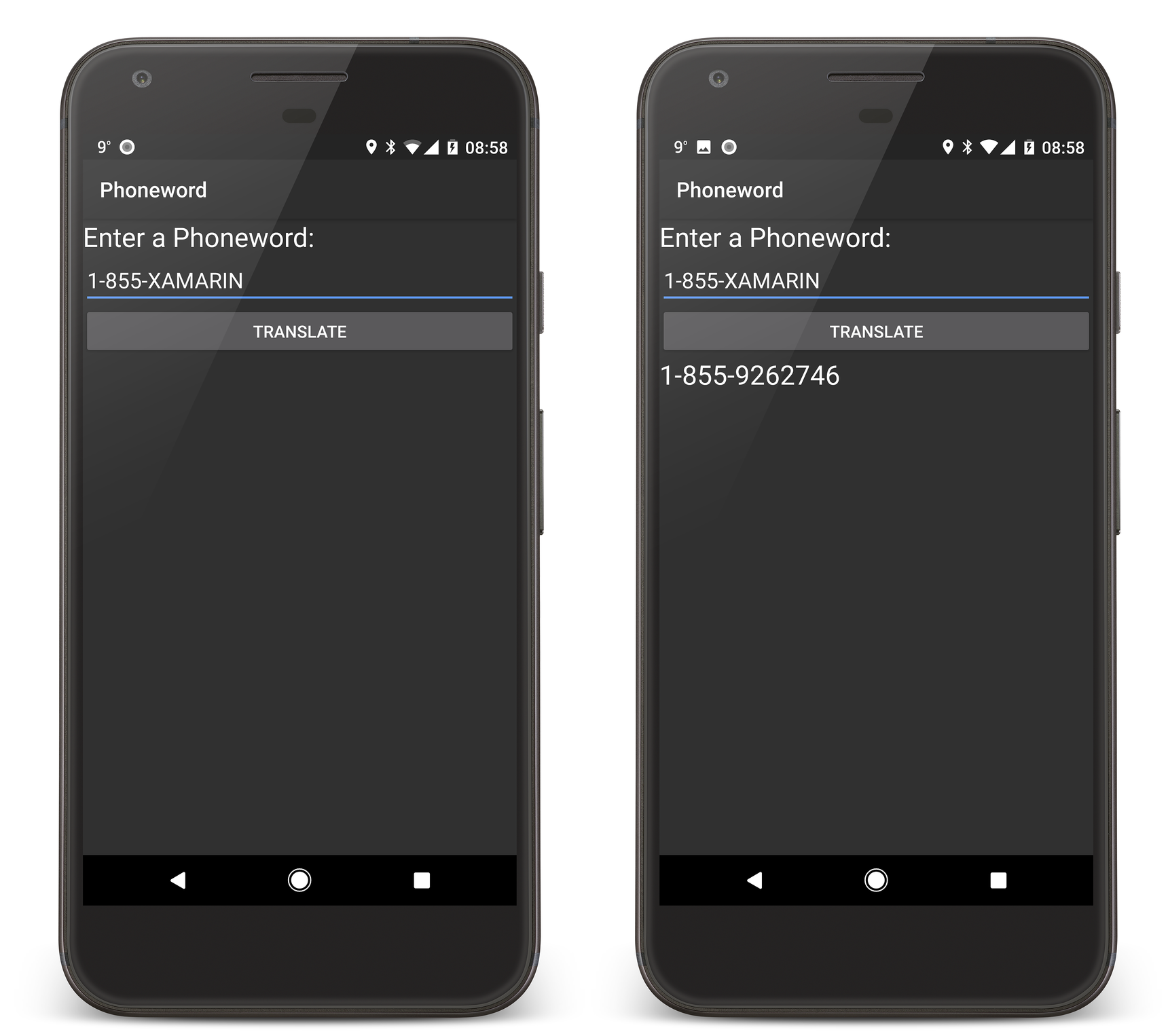 Test the application by running it on an Android device or emulator. Tap the TRANSLATE button to translate 1-855-XAMARIN into a phone number: