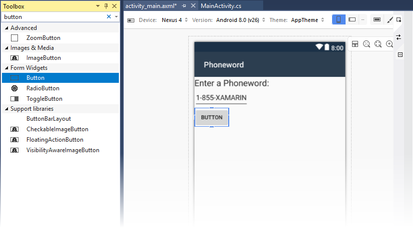 After the new project is created, expand the Resources folder and then the layout folder in the Solution Explorer. Double-click activity_main.axml to open it in the Android Designer. This is the layout file for the app's screen: