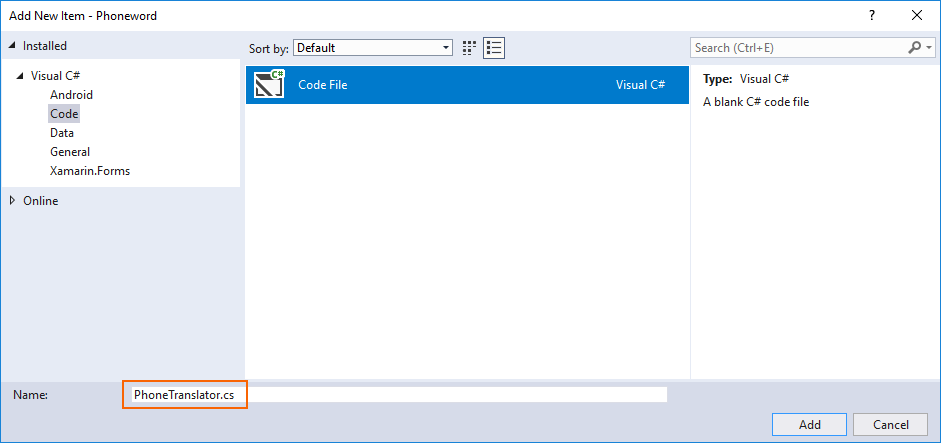 In the Add New Item dialog, select Visual C# > Code > Code File and name the new code file PhoneTranslator.cs: