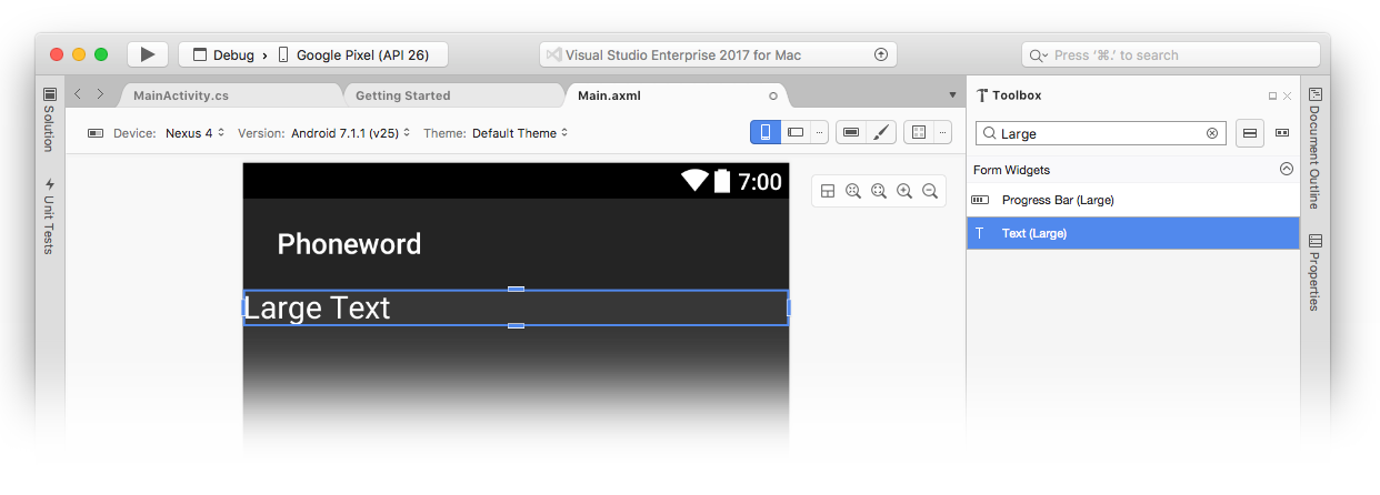 After the new project is created, expand the Resources folder and then the layout folder in the Solution pad. Double-click Main.axml to open it in the Android Designer. This is the layout file for the screen when it is viewed in the Android Designer: