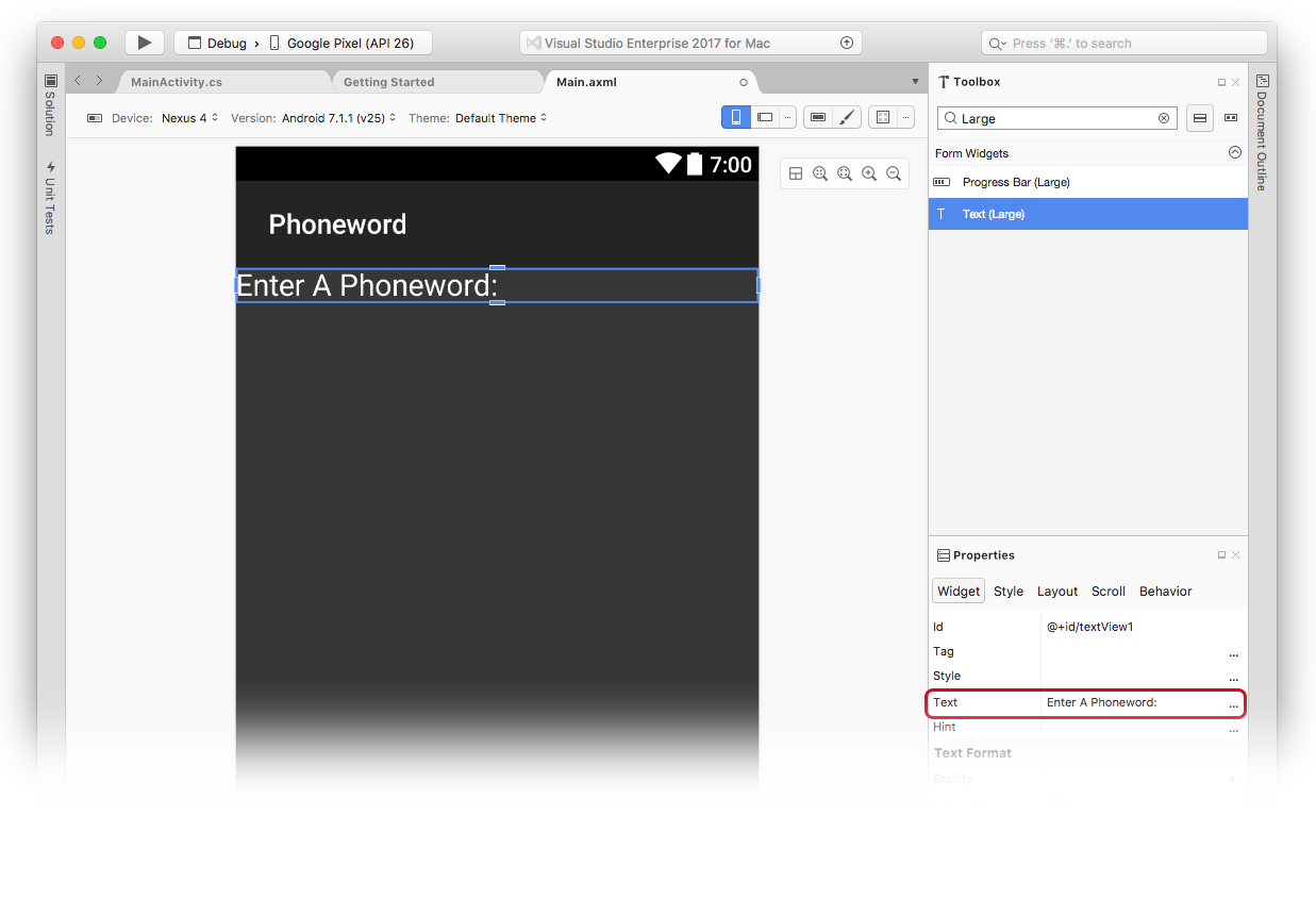 Text (Large) widget to Enter a Phoneword: as shown below: