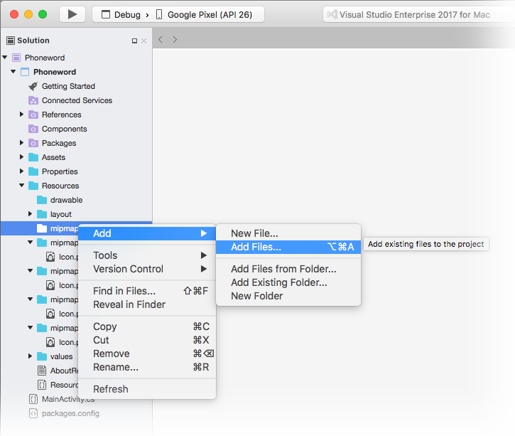Next, download and unzip Xamarin App Icons set. This zip file holds the icons for the application. Each icon is visually identical but at different resolutions it renders correctly on different devices with different screen densities. The set of files must be copied into the Xamarin.Android project. In Visual Studio for Mac, in the Solution Pad, right-click the mipmap-hdpi folder and select Add > Add Files: