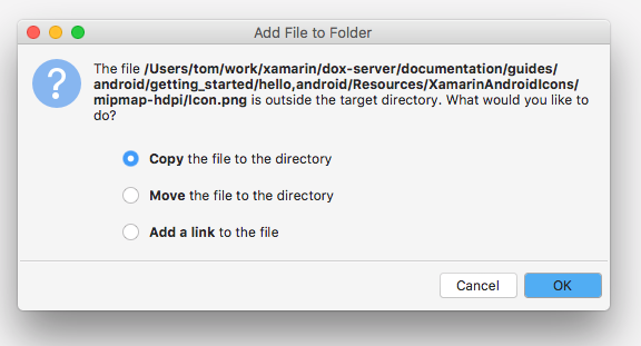 In the Add File to Folder dialog box, select Copy the file into the directory and click OK: