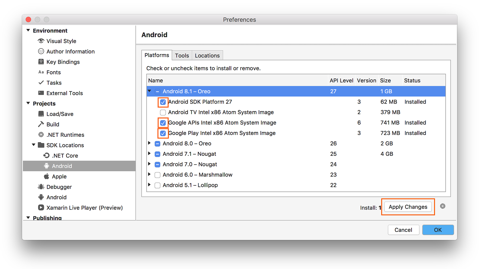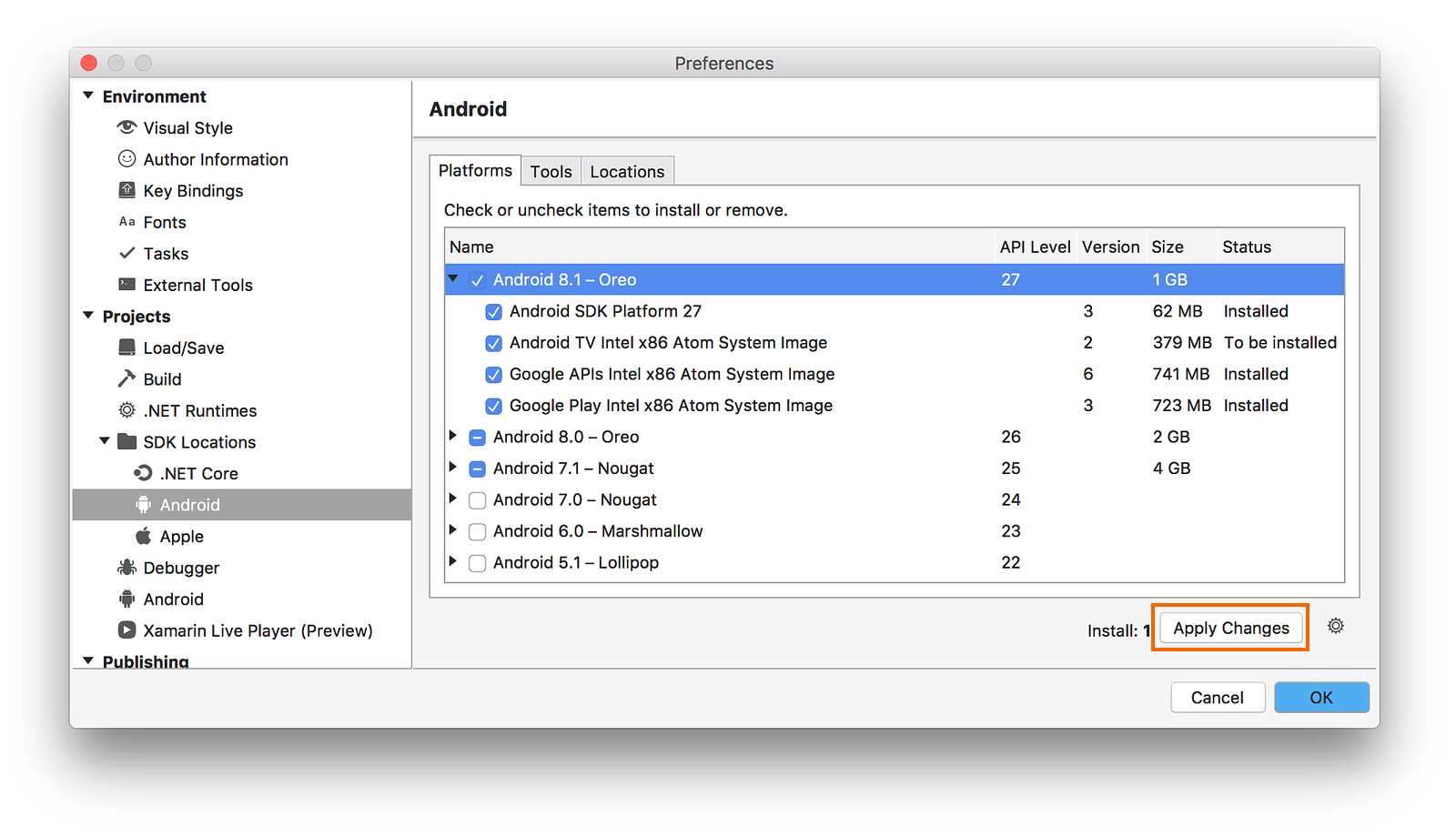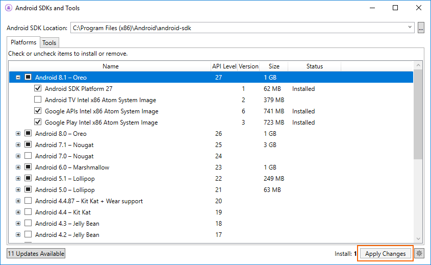 To add another platform to the SDK, click the box next to the platform until the checkmark appears to install all of its components, then click Apply Changes: