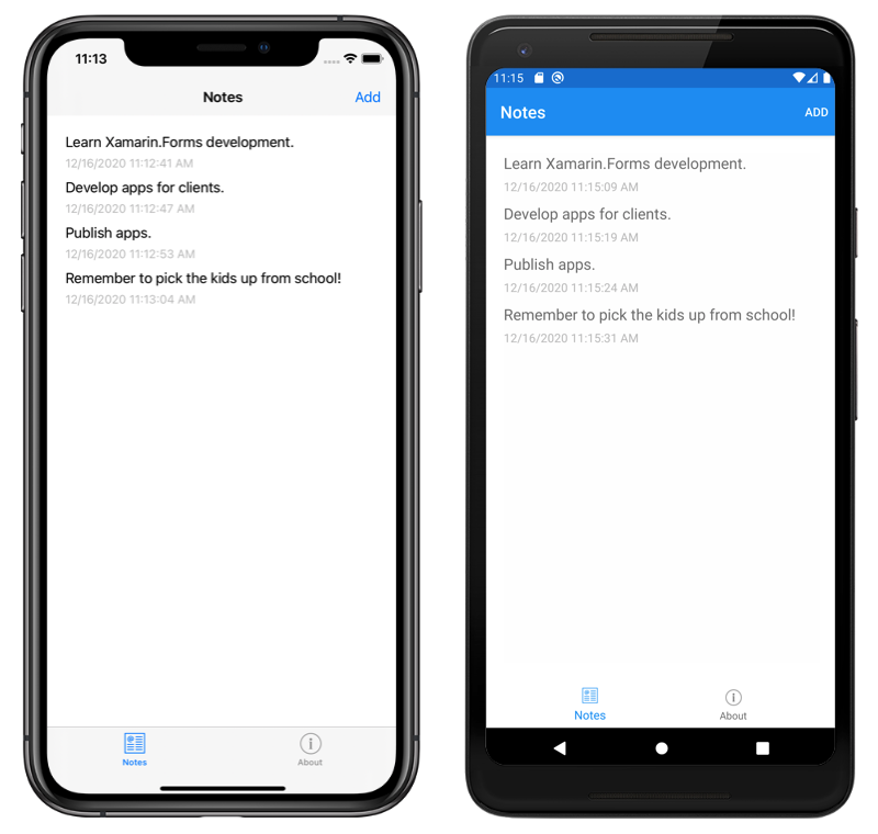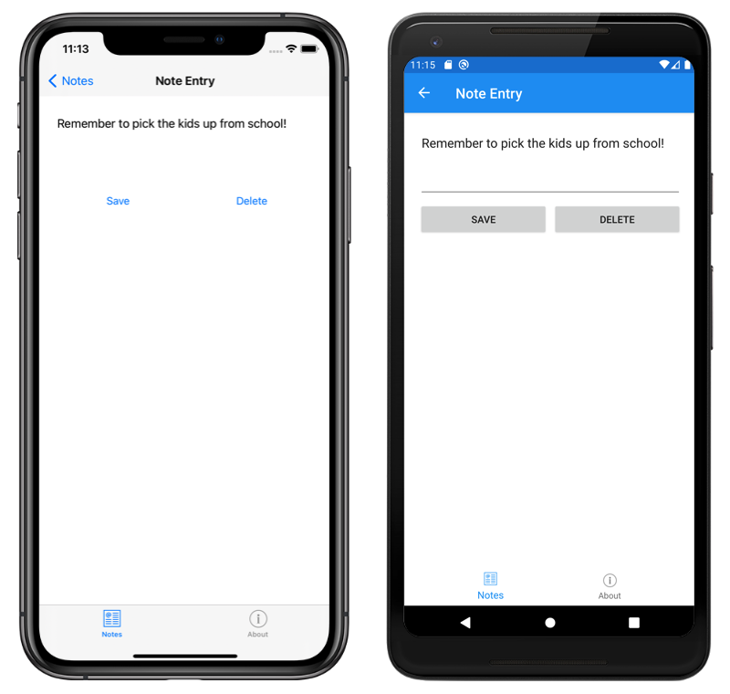 NoteEntryPageuses theLoadNotemethod to retrieve the note from the database, whose ID was passed as a query parameter to the page, and store it as aNoteobject in theBindingContextof the page. When theOnSaveButtonClickedevent handler is executed, theNoteinstance is saved to the database and the application navigates back to the previous page. When theOnDeleteButtonClickedevent handler is executed, theNoteinstance is deleted from the database and the application navigates back to the previous page.Save the changes to NoteEntryPage.xaml.cs by choosing File > Save (or by pressing ⌘ + S).