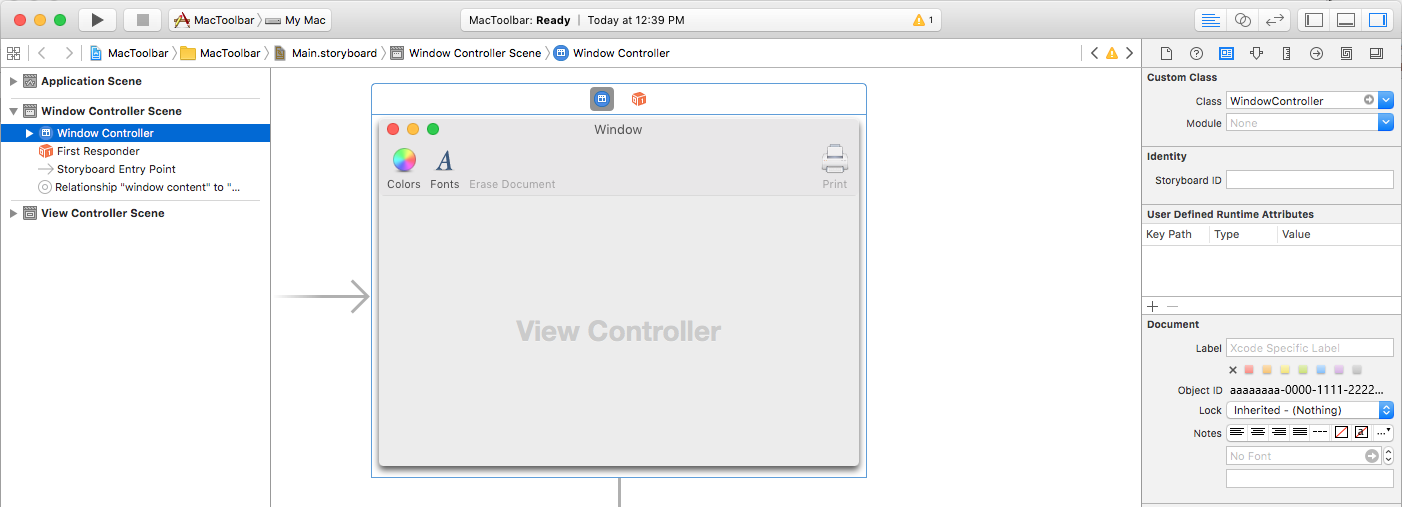 Double-click Main.storyboard to open it in Xcode. Select the Trash toolbar item created above and change its class to "ActivatableItem" in the Identity Inspector: