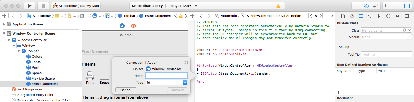 Create an outlet called trashItem for the Trash toolbar item. Save changes and return to Visual Studio for Mac to sync with Xcode. Finally, open MainWindow.cs and update the AwakeFromNib method to read as follows: