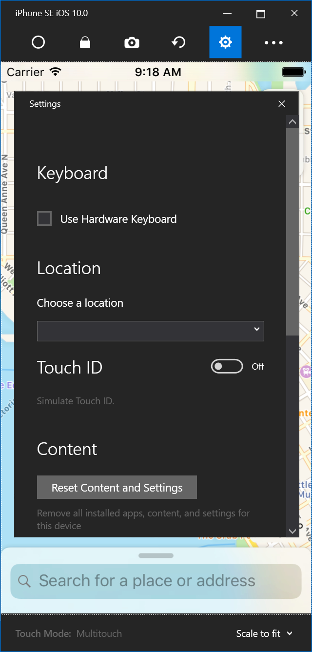 These settings allow you to enable the hardware keyboard, choose a location that the device should report (static and moving locations are both supported), enable Touch ID, and reset the content and settings for the simulator.