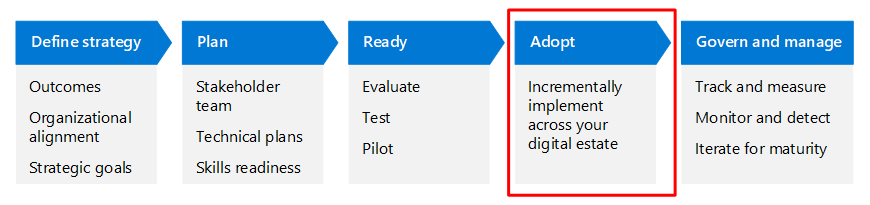 In the adoption phase, you incrementally implement your technical plans across your digital estate. You'll need to categorize the technical plans by area and work with the corresponding teams to accomplish this phase.