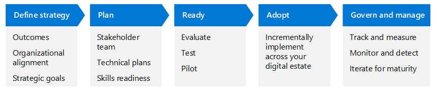 This article uses the same lifecycle phases as the Cloud Adoption Framework for Azure—Define strategy, Plan, Ready, Adopt, and Govern and manage—but adapted for Zero Trust.