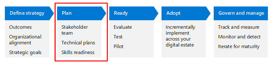 | Define strategy | Plan | Ready | Adopt | Govern and manage |