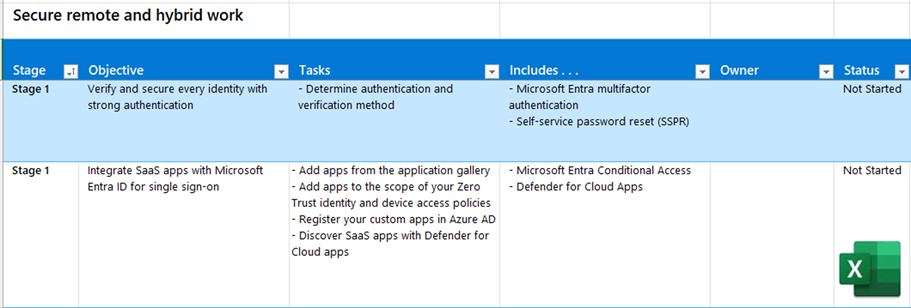 This guidance also includes an Excel workbook with worksheets for each business scenario that you can use to assign owners and track progress for each stage, objective, and task. Here's an example.