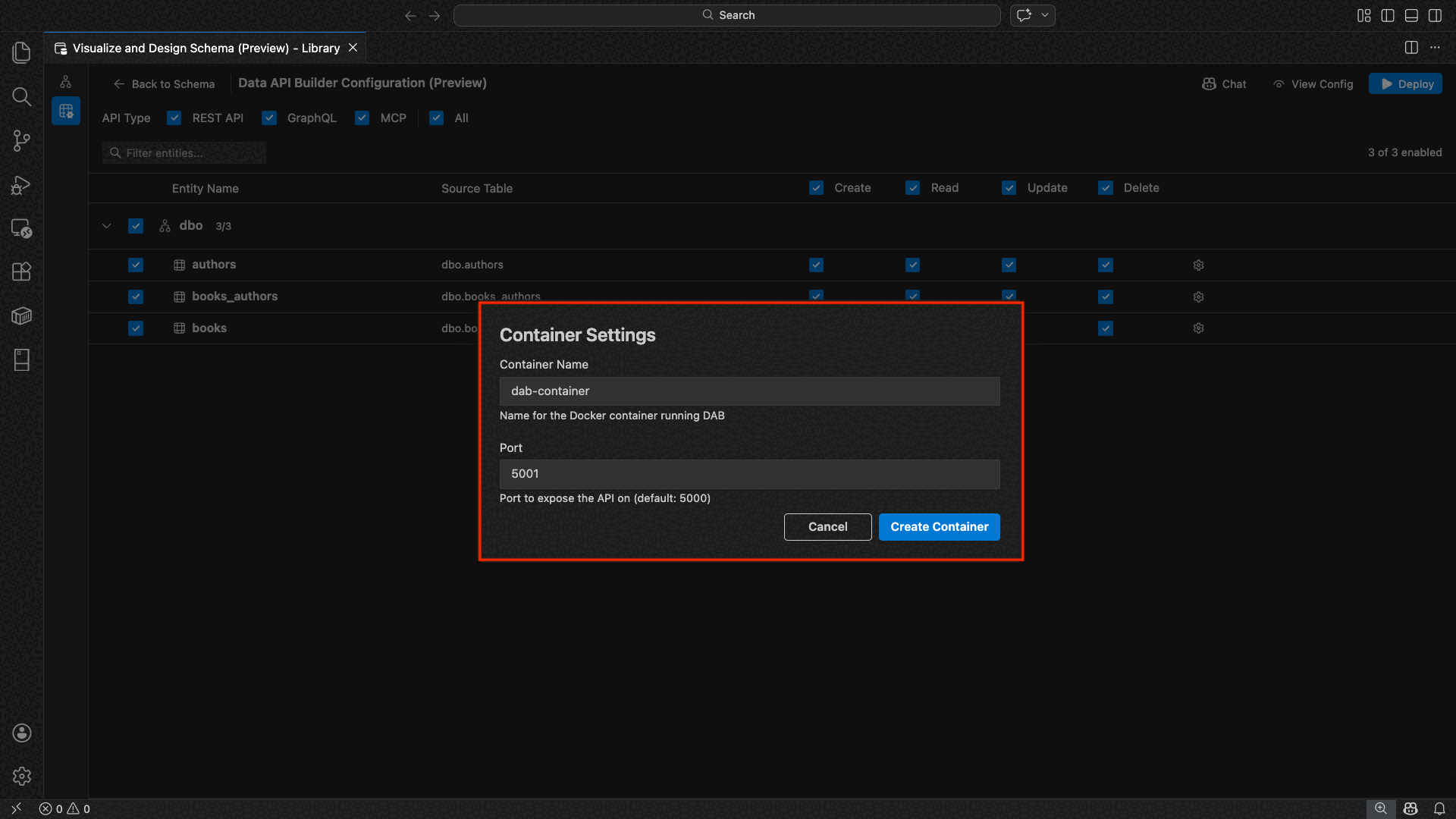 The MSSQL extension for Visual Studio Code includes an integrated UI for Data API builder, so you can create REST, GraphQL, and MCP endpoints for your SQL database tables without writing configuration files or leaving Visual Studio Code. You can select which tables to expose, configure CRUD permissions, choose API types, preview the generated configuration, and deploy a local backend powered by Data API builder, all from a visual interface.