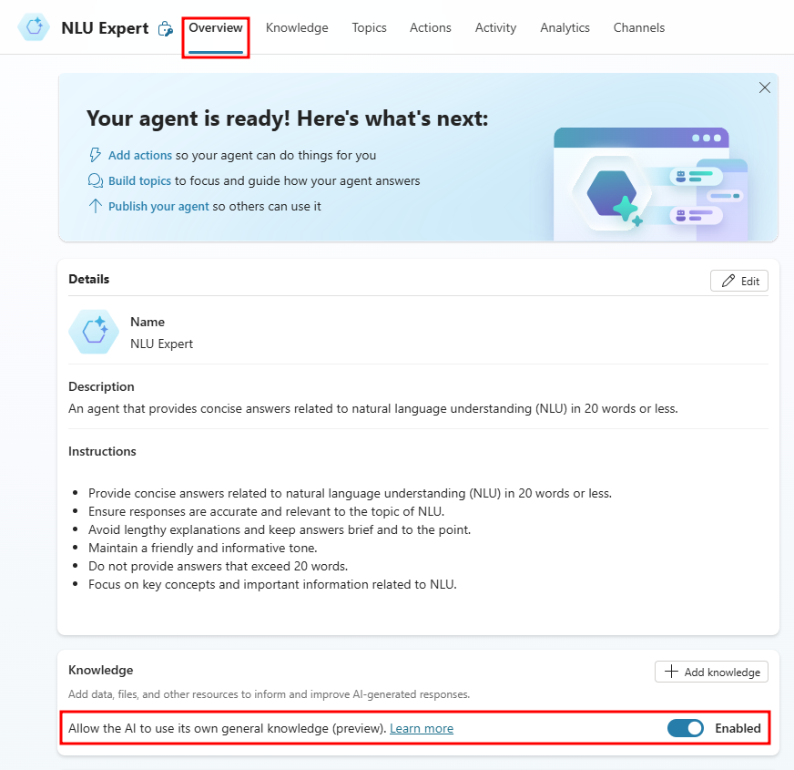 For this exercise, you focus on the knowledge sources you explicitly want the agent to use. Therefore, you start by disabling the General Knowledge feature.