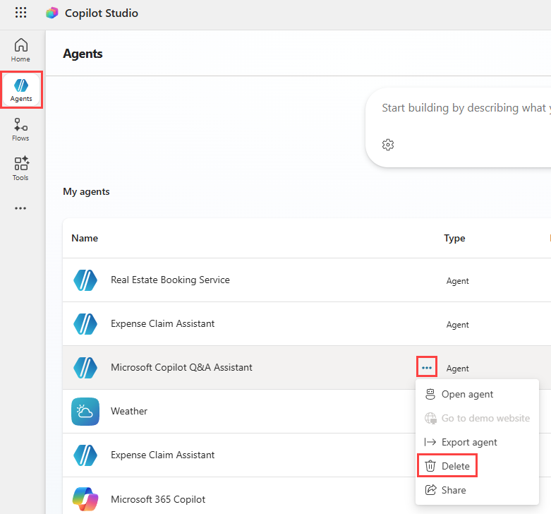 1. When editing an agent, you can select the Delete button on the command bar to delete the agent and enter the name of the agent to confirm deletion.
