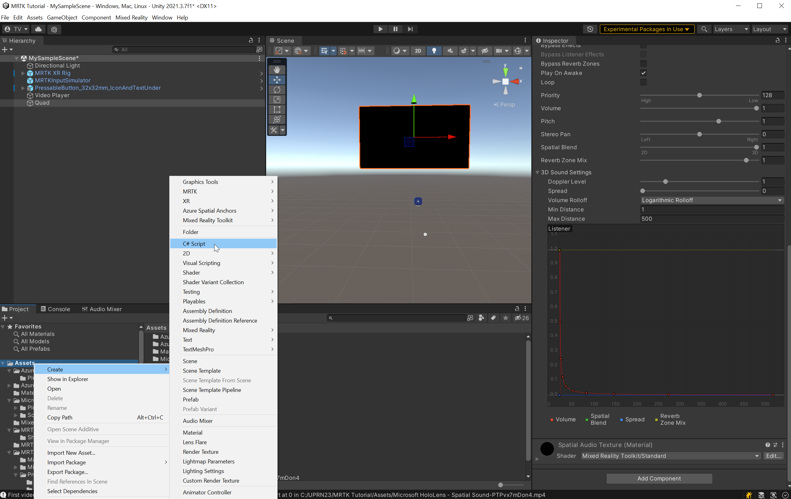 Right-click in the Project window and choose Create > C# Script to create a new C# script. Enter a suitable name for the script; for example, SpatializeOnOff.