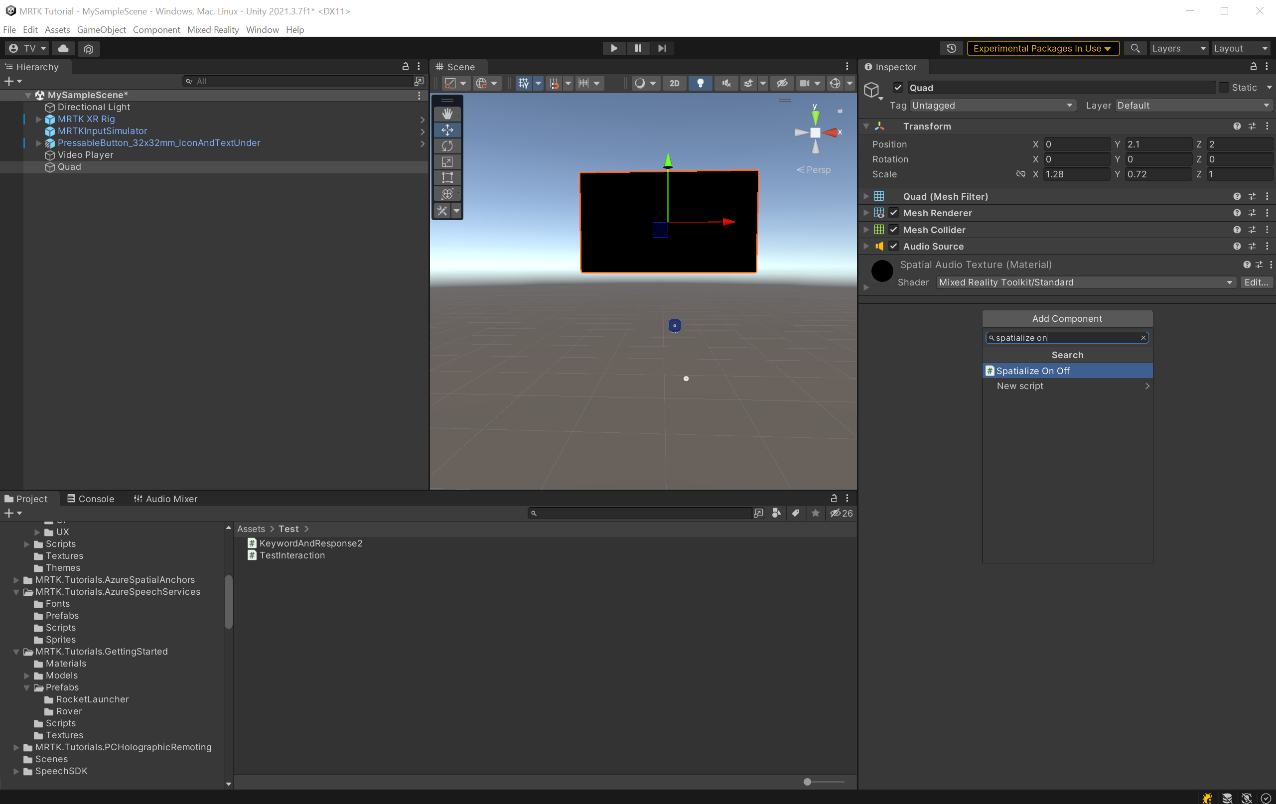 Select Quad in the Hierarchy. In the Inspector window, use the Add Component button to add SpatializeOnOff(Script)