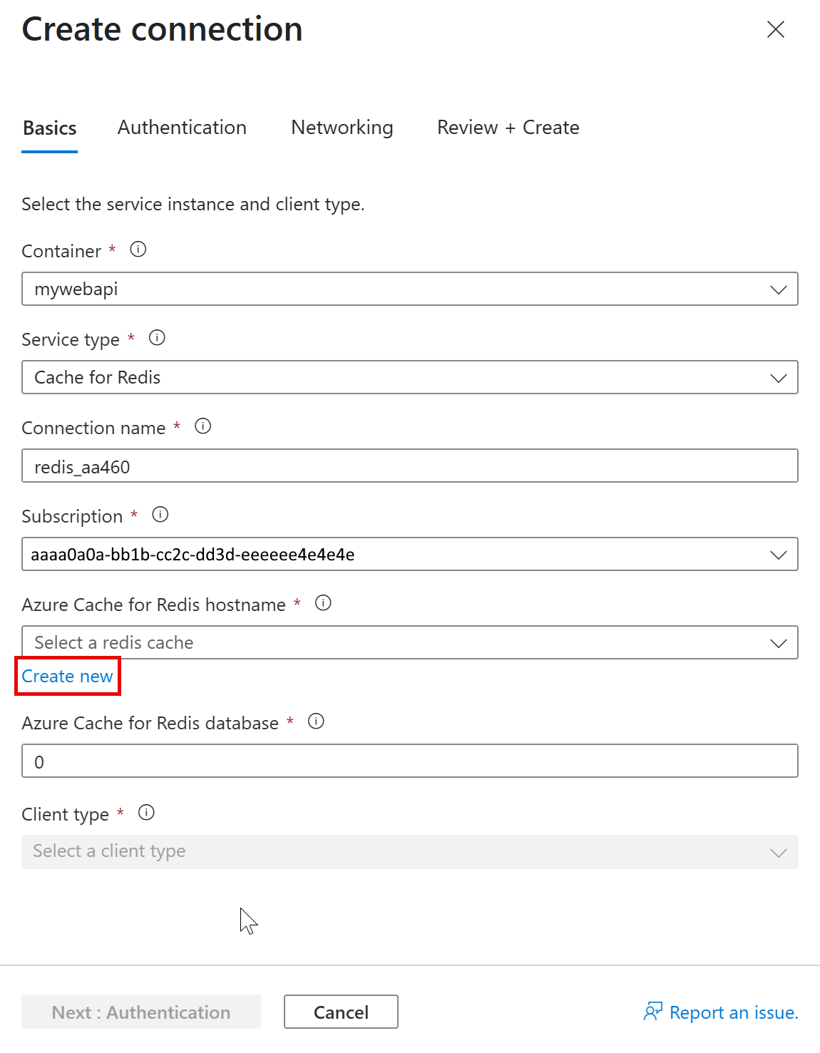 5. Move to the Authentication tab. Choose System-assigned managed identity. Accept all other defaults, and select Create. This creates the connection to the cache.