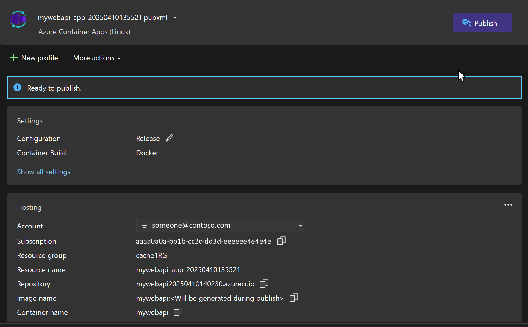 You see a page that shows the activity in Azure, and when you close it, the Publish screen now has your container app's information, such as the URL for ingress to the web API.