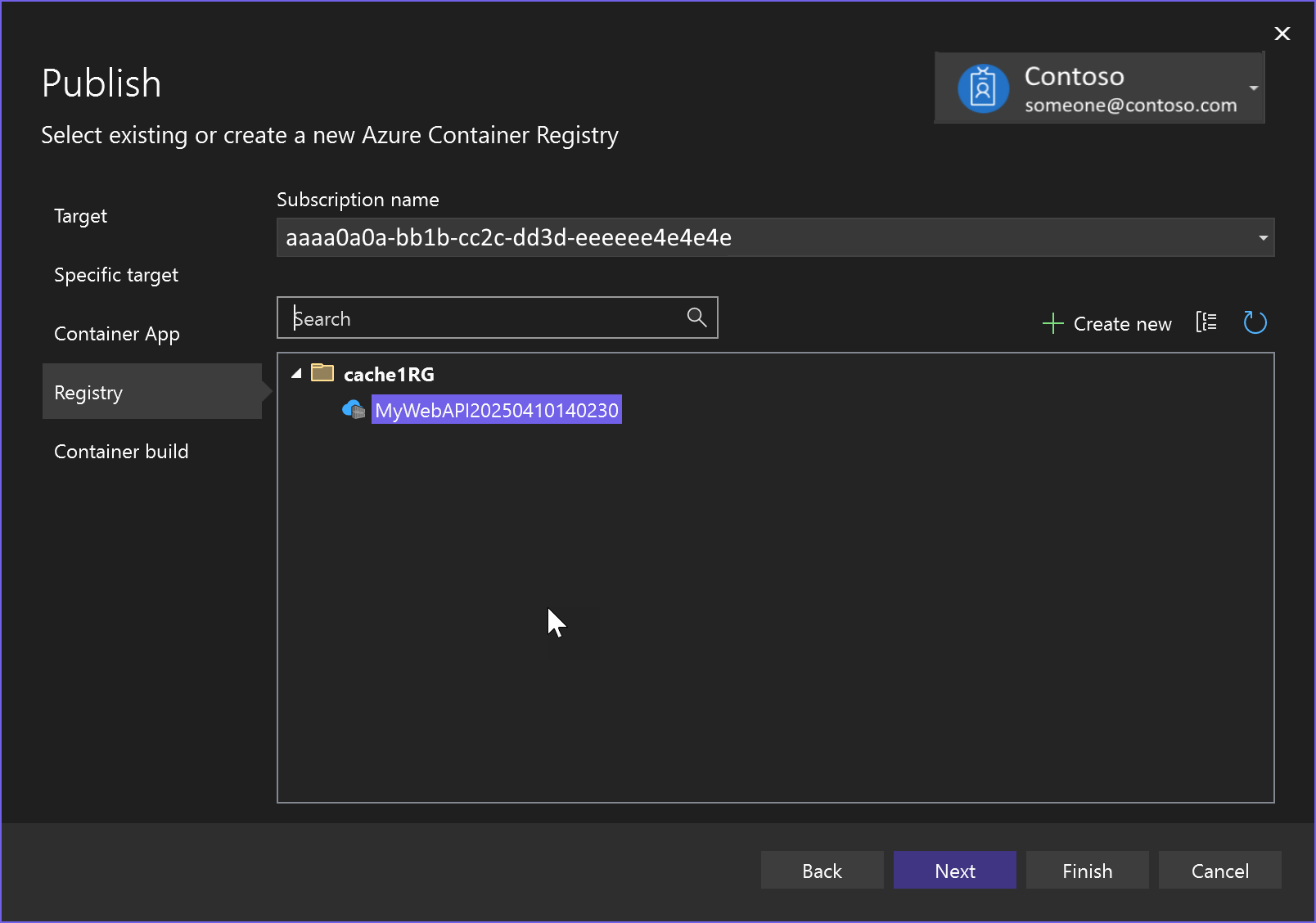 2. In Solution Explorer, right-click on the project node for the Webfrontend project, and select Publish. On the next screen, select Create new to create a new container app.