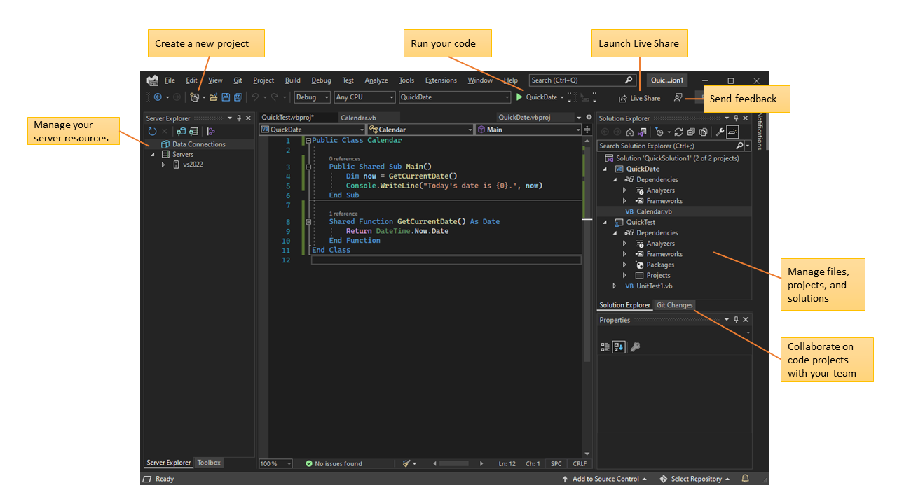 The preceding image shows Visual Studio with an open Visual Basic project that shows key windows and their functionality: