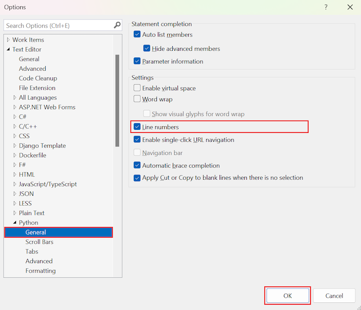 Screenshot that shows how to enable line numbering in the editor with the Languages Python General Line numbers option.