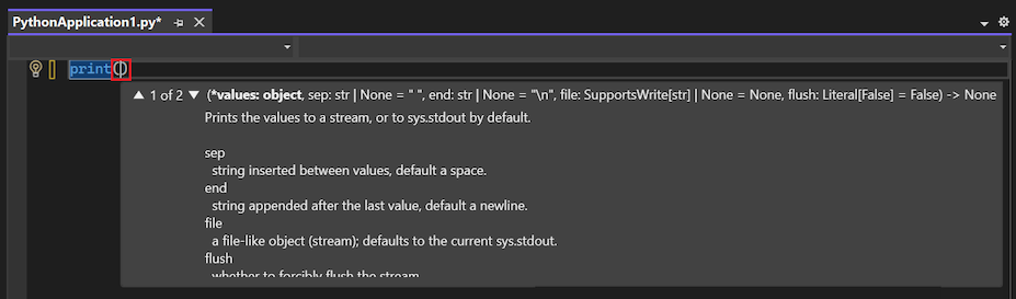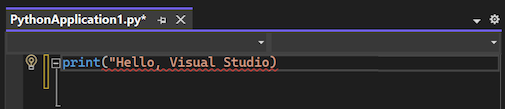 Notice how Visual Studio applies different syntax coloration for the print function versus the function argument "Hello, Visual Studio". Visual Studio also uses coloring and formatting techniques to help you read your code. For example, Visual Studio uses underlining to draw your attention to issues with your code.