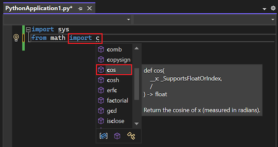 In addition to completions for statements and functions, IntelliSense provides completions for Python import and from statements. These completions help you easily discover what modules are available in your environment and the members of those modules.