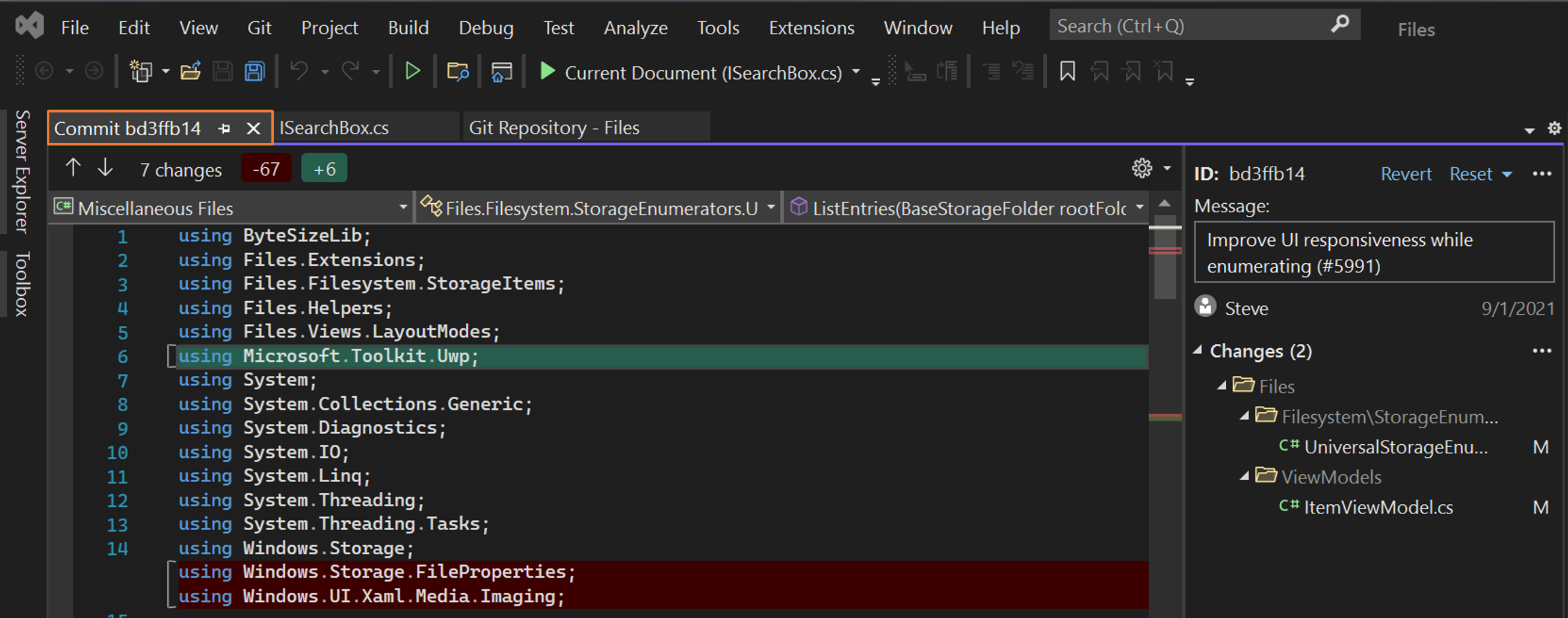 3. Commit: To open this section, select any commit in the Graph section. You can check the changes that a commit has introduced by selecting them, which shows a difference. For example, the previous screenshot shows the changes that one commit introduced to the Resize.cs file.