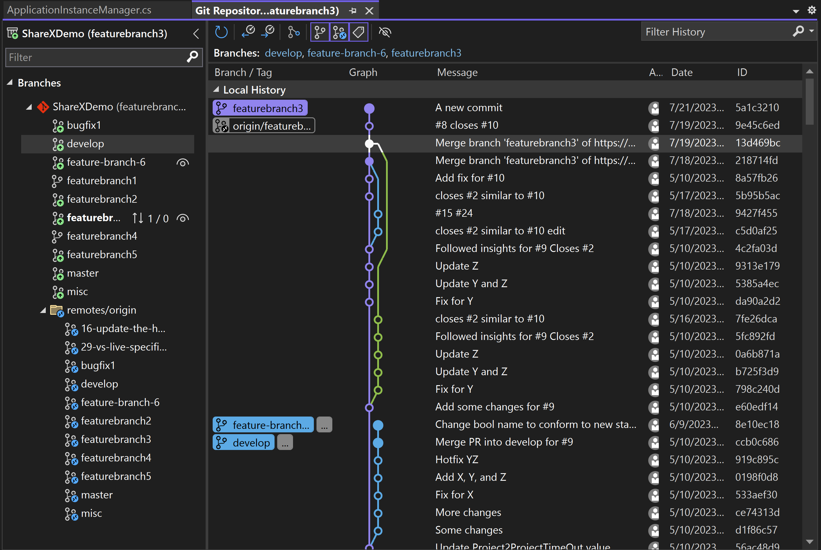 New with version 17.7: When you open the Git Repo window, you start in the single branch view. You can then select any branch to add both the branch and its commits to a multi-branch history view, which adds visual cues that make it more efficient to interact with multiple branches.