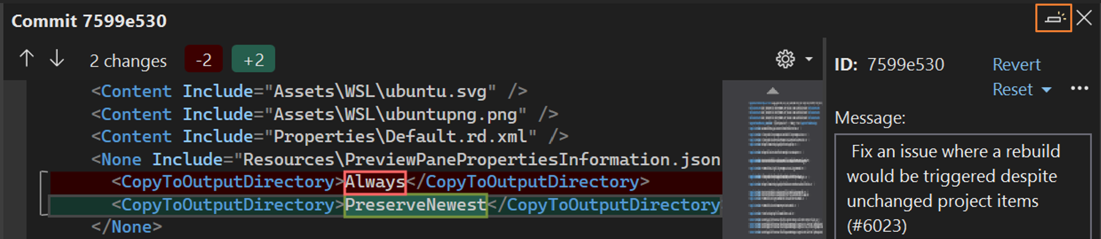 Similar to Commit Details, you can use the Open in New Tab button to open the comparison on a different tab or maximize it on the screen.