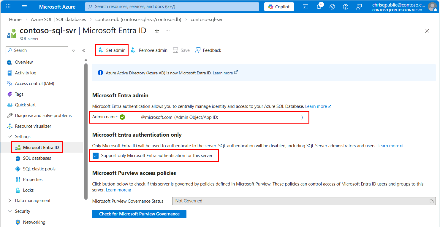 El servidor también debe tener habilitada la autenticación de Microsoft Entra y tener asignada una cuenta de administrador de Microsoft Entra. Para las conexiones de desarrollo local, la cuenta de administrador de Microsoft Entra debe ser una cuenta que también puede iniciar sesión en Visual Studio o en la CLI de Azure localmente. Puede comprobar si el servidor tiene habilitada la autenticación de Microsoft Entra en la página de Microsoft Entra ID del servidor lógico.