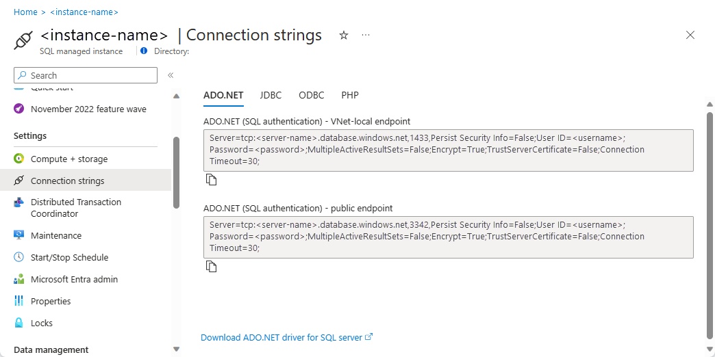 - Obtener la cadena de conexión del punto de conexión público de la instancia SQL administrada