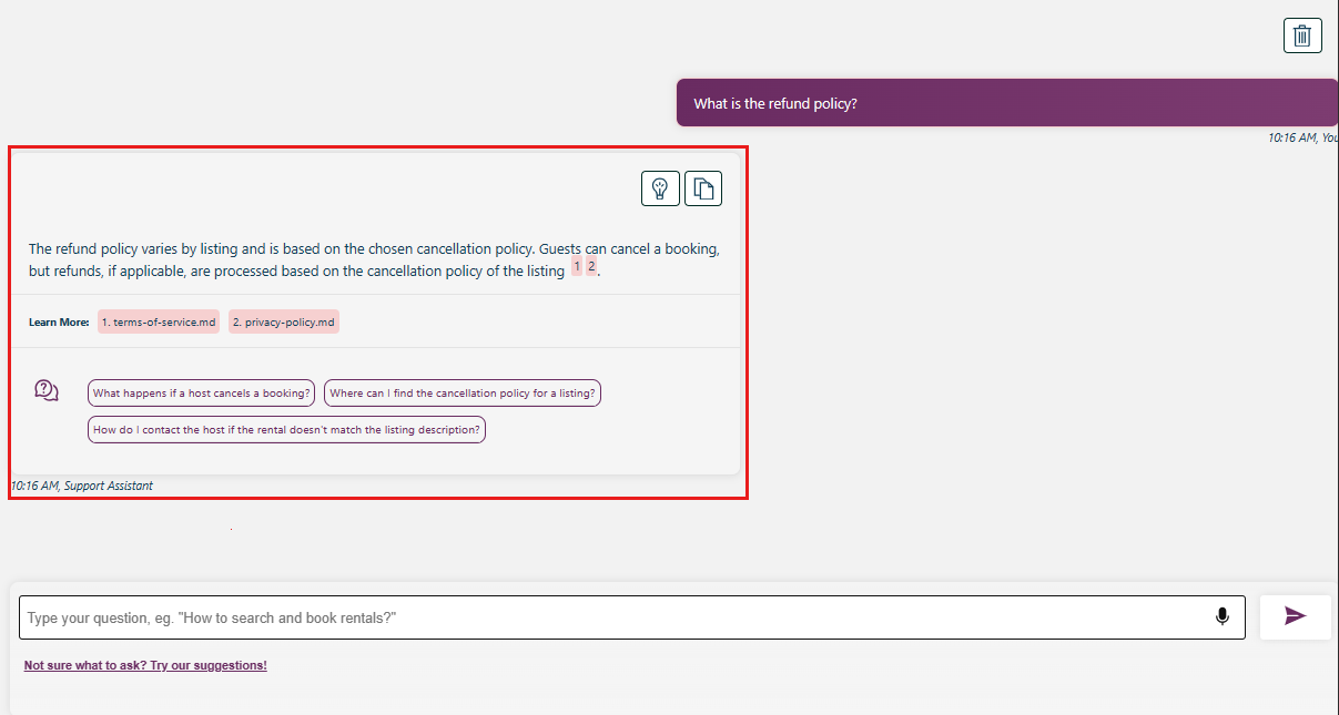 La aplicación de chat está precargada con información sobre alquileres de un catálogo de archivos Markdown. Puede usar la aplicación de chat para hacer preguntas sobre el proceso de alquiler. Los siguientes pasos le guiarán a través del proceso de uso de la aplicación de chat.