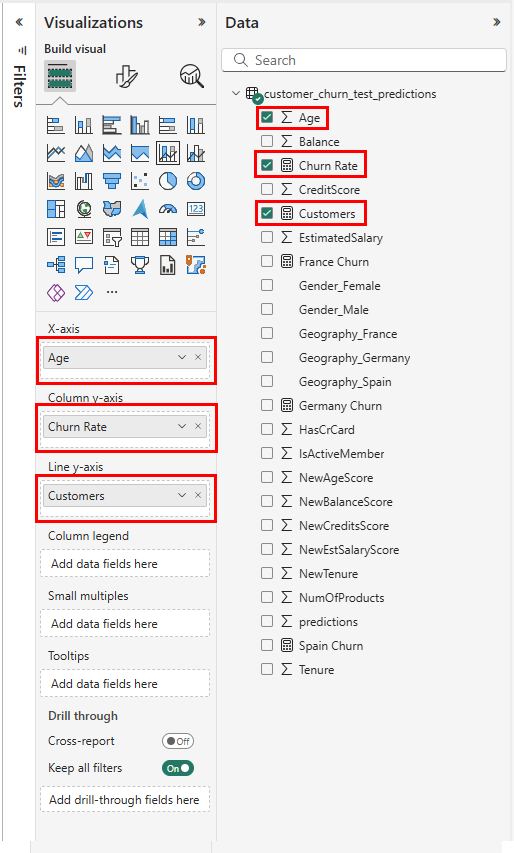 En el panel Visualizaciones, seleccione el icono Gráfico de columnas apiladas y de líneas. Con pasos similares a la configuración anterior del gráfico de columnas apiladas y línea, seleccione NumOfProducts para el eje X, Abandono para el eje Y de columna, y Clientes para el eje Y de línea, como se muestra en el recorte de pantalla siguiente: