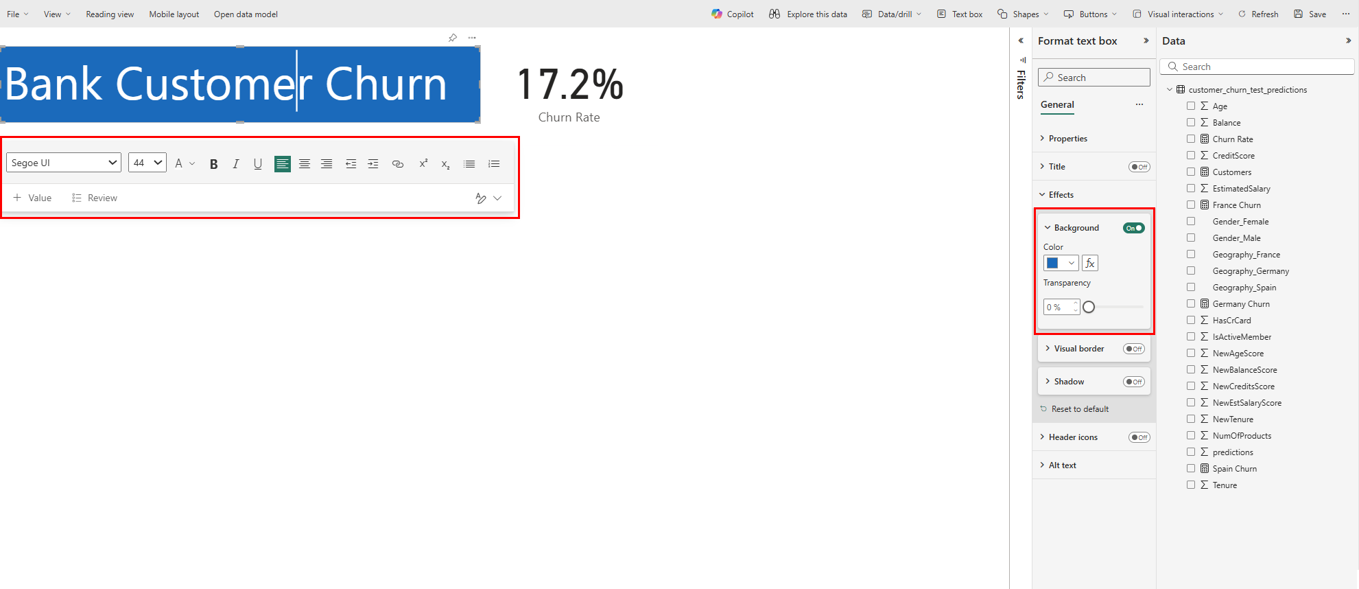Measure =en la barra de fórmulas por:Germany Churn = CALCULATE(AVERAGE(customer_churn_test_predictions[predictions]),FILTER(customer_churn_test_predictions, customer_churn_test_predictions[Geography_Germany] = TRUE()))Esta instrucción extrae esas filas que tienen Alemania como su geografía (Geography_Germany es igual a uno).