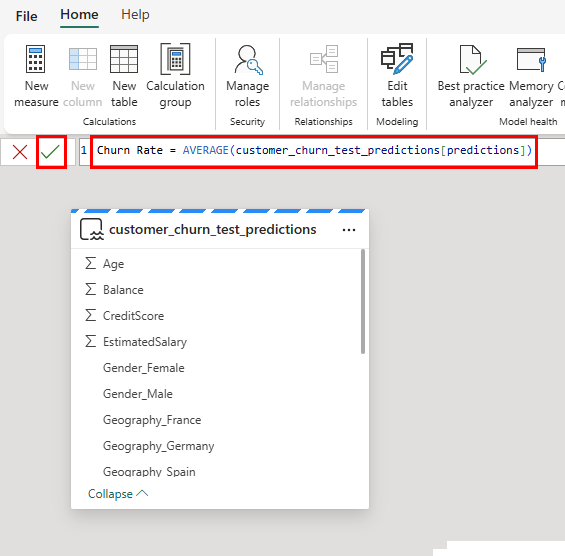 Measure =en la barra de fórmulas por el siguiente fragmento de código:Churn Rate = AVERAGE(customer_churn_test_predictions[predictions])Para aplicar la fórmula, seleccione la marca de verificación en la barra de fórmulas, como se muestra en la captura de pantalla siguiente: