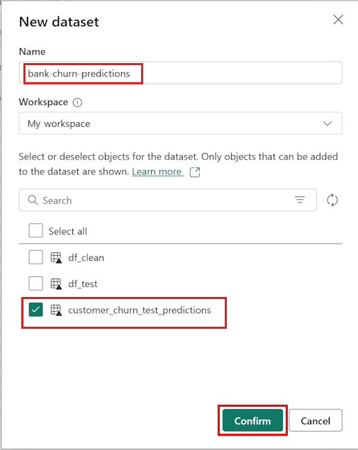Asigne un nombre al modelo semántico, por ejemplo, "predicciones de abandono bancario." A continuación, seleccione el conjunto de datos customer_churn_test_predictions tal como se muestra en la captura de pantalla siguiente.
