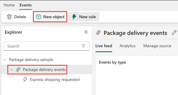 Seleccione el flujo eventos de entrega de paquetes y, a continuación, seleccione Nuevo objeto en la cinta de opciones.