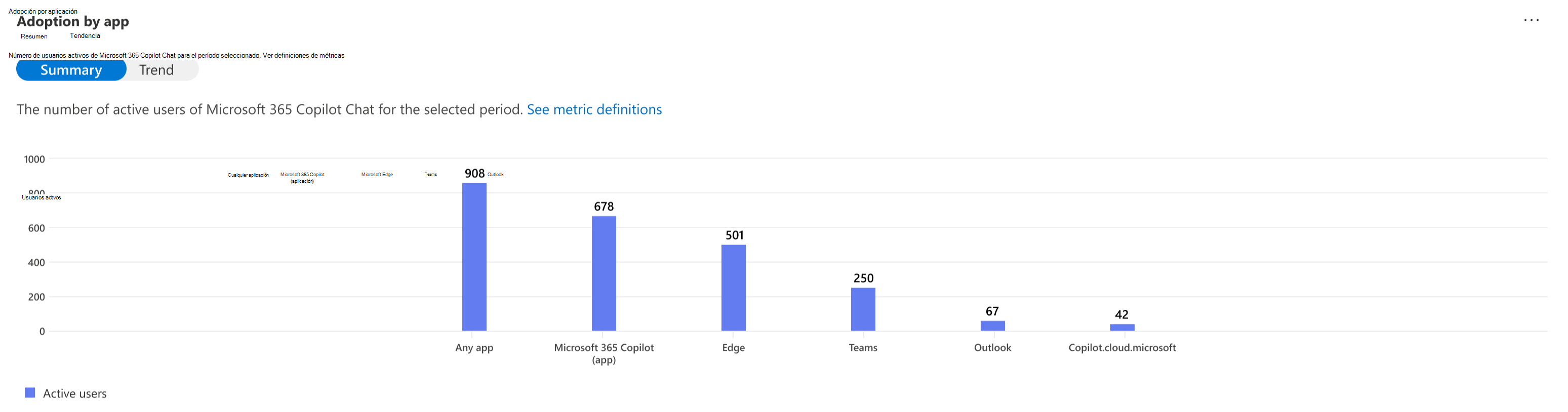 - Los usuarios activos muestran el número total de usuarios que enviaron al menos un mensaje para Microsoft 365 Copilot Chat durante el período seleccionado.