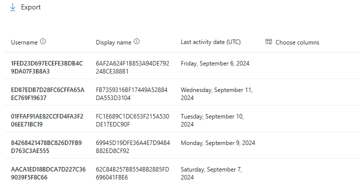 Puede ver una tabla que muestra cada usuario activo que ha accedido a Microsoft 365 Copilot Chat en los últimos 180 días.