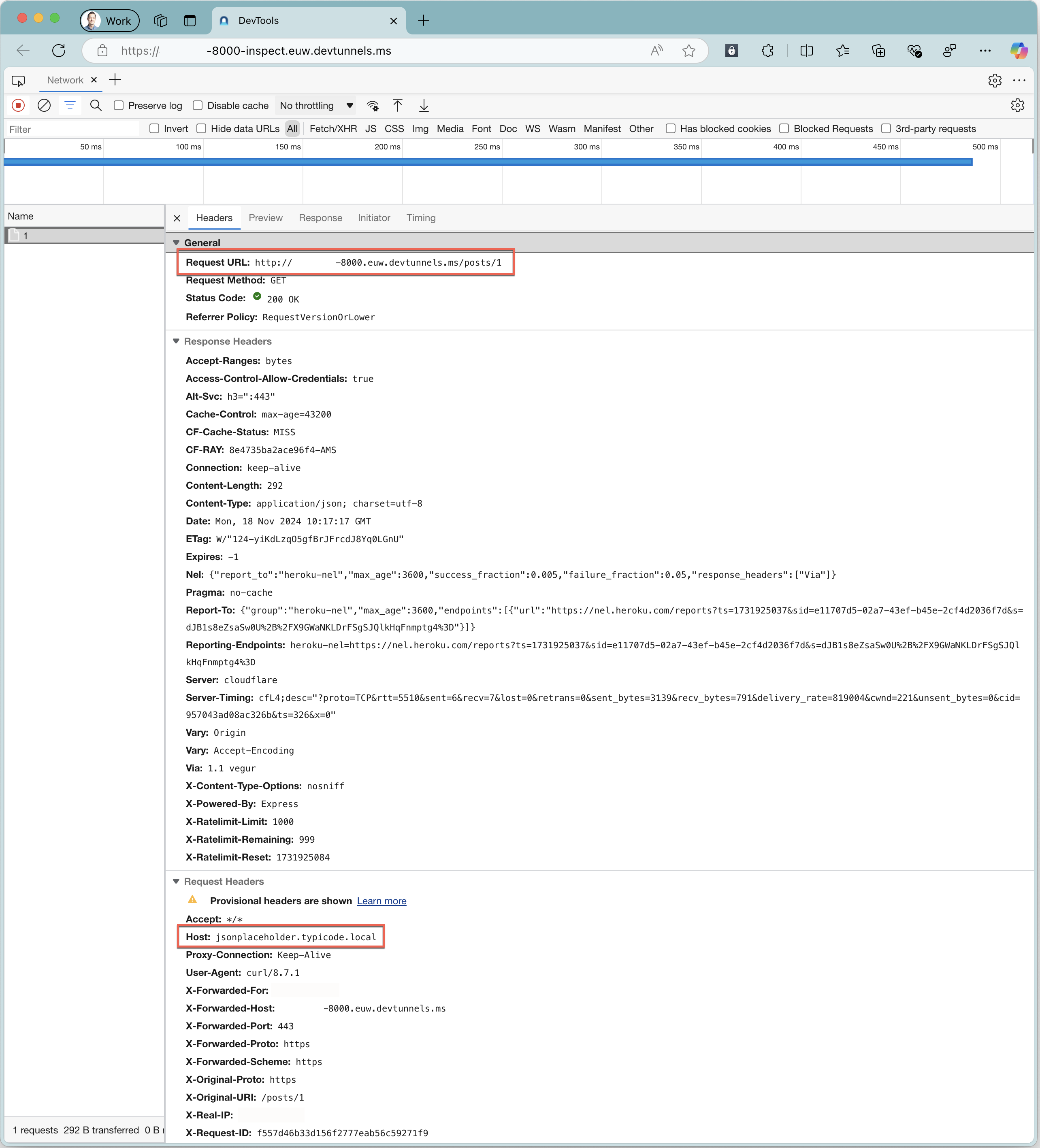 curl https://tunnel_id-8000.euw.devtunnels.ms/posts/1.En el explorador web con Chrome Dev Tools, observe la información sobre la solicitud interceptada y la respuesta de la API en la nube.
